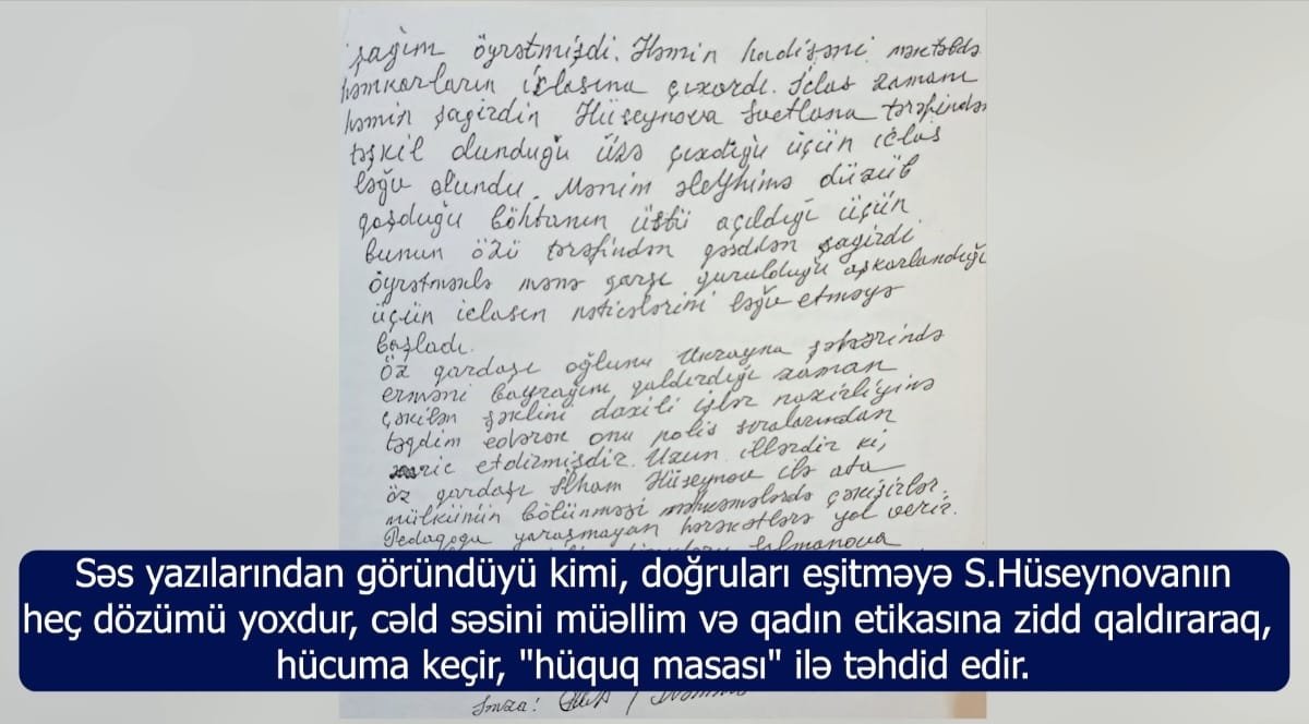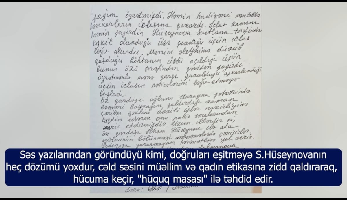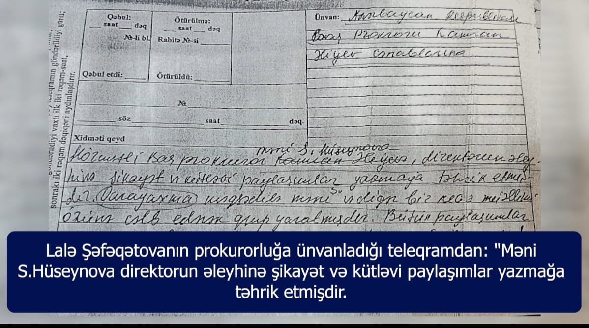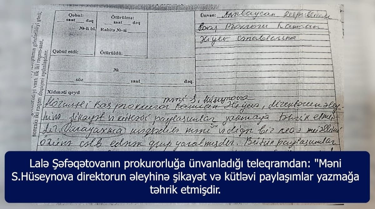 Keçmiş müəllim Lalə Şəfəqətovanın prokurorluğa ünvanladığı rəsmi teleqramda isə daha ciddi ittihamlar yer alır. Onun sözlərinə görə, S.Hüseynova onu və daha bir neçə müəllimi direktor əleyhinə şikayət və kütləvi paylaşımlar etməyə təhrik edib: