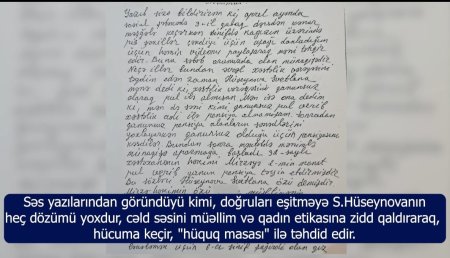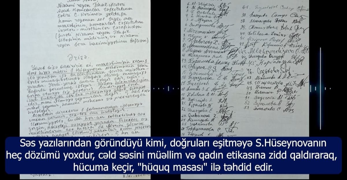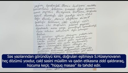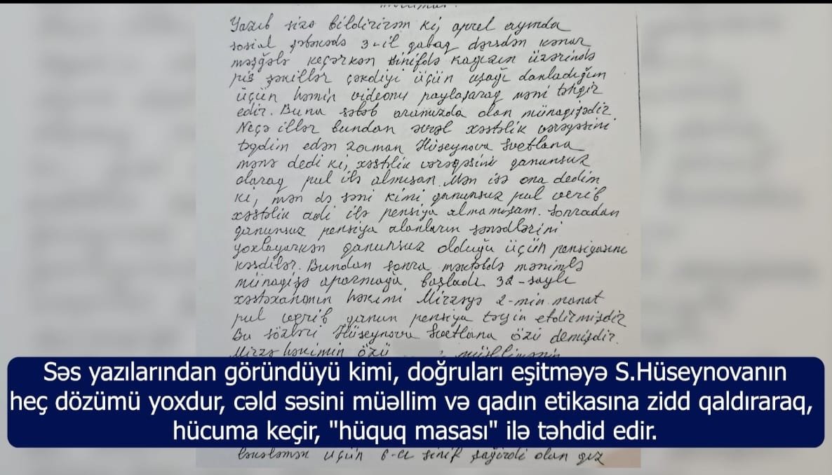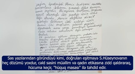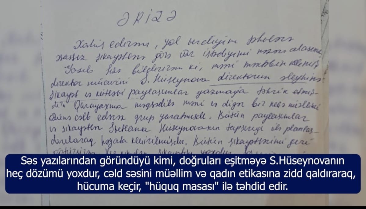 “Məni S.Hüseynova direktorun əleyhinə şikayət və paylaşımlar yazmağa məcbur etdi. Qarayaxma məqsədilə müəllimlərdən ibarət qrup yaradaraq bizə rəhbərlik edirdi. Bütün paylaşımlar onun göstərişi ilə hazırlanıb”, – deyə müraciətdə bildirilir.