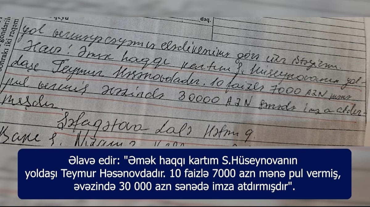 “10 faizlə 7000 manat pul vermiş, əvəzində 30.000 manatlıq sənədə imza atdırmışdır.”
