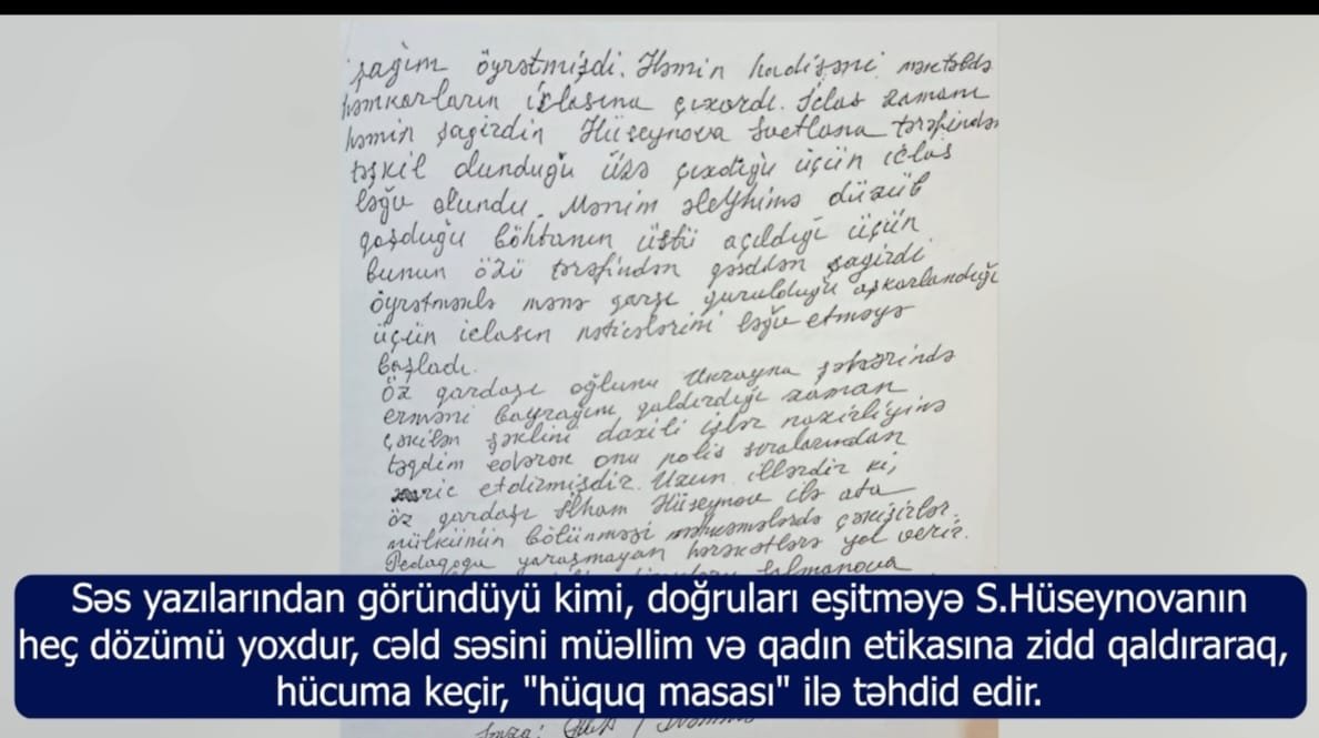 Müəllimlər tərəfindən təqdim edilən səs yazılarında Svetlana Hüseynovanın etiraza dözümsüz yanaşdığı, müəllim zidd tərzdə səsini yüksəldərək qarşı tərəfi təhdid etdiyi də eşidilir. Onun tez-tez “hüquq masası” ifadəsi ilə qarşı tərəfi susdurmağa çalışdığı vurğulanır.